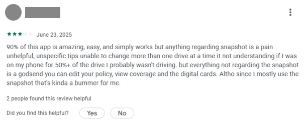 The Progressive app has received positive feedback, with more than 4.5 out of 5 stars in both Google Play and the Apple App Store. But Android users seem to report more difficulties with Snapshot itself. For example, one reviewer said: