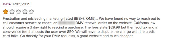 Users report being charged higher fees than through their local DMV and being unable to reach DMV.org customer service.[1]