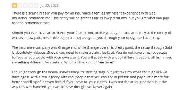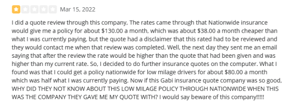 Some customers are pleased with Gabi, mentioning that they were able to get a better rate and reduce their car insurance premiums by hundreds of dollars. But others complained about misleadingly cheap rates, like the following reviews on the BBB.