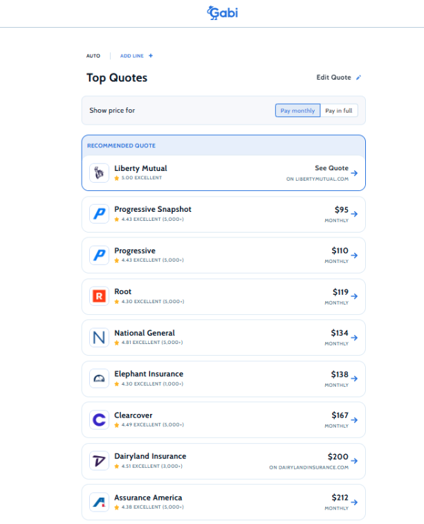Gabi is an online insurance broker with licenses in every state.[1] It’s an all-in-one insurance-shopping tool that allows customers to compare, buy, and manage policies on the site. Gabi simplifies the comparison process by automatically gathering quotes from dozens of insurance companies, allowing you to find the best insurance for your needs.