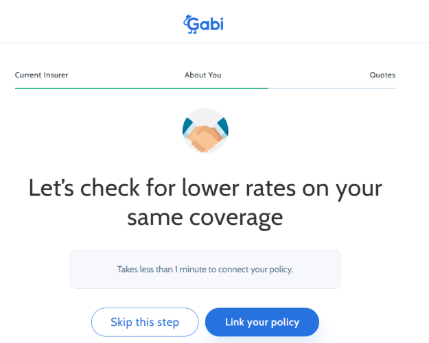 Gabi, recently acquired by Experian, has been helping consumers compare auto insurance quotes for nearly eight years.[3] It’s a popular pick with busy customers who want to manage all their insurance policies in one place. The service is easy to use. You just need to input your personal information, including current policy details, to view quotes within a few minutes.