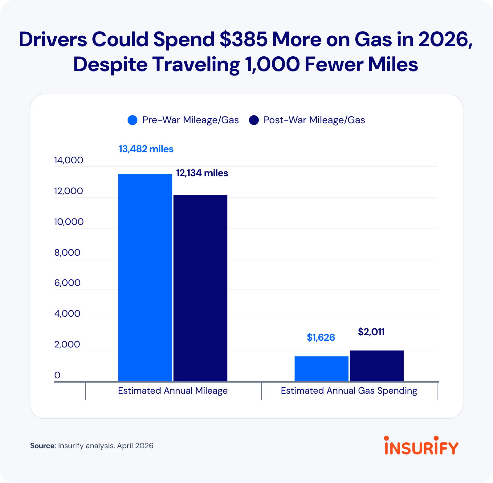 Before the war, the average American was on track to spend about $1,626 on gas over 13,482 miles (12 cents per mile) in 2026, based on an average gas price of $2.94. If drivers reduce their annual mileage by 10% in 2026 and gas prices remain at $4.04, then drivers could spend $385 more on gas, despite driving 1,348 fewer miles — $2,011 at 17 cents per mile.