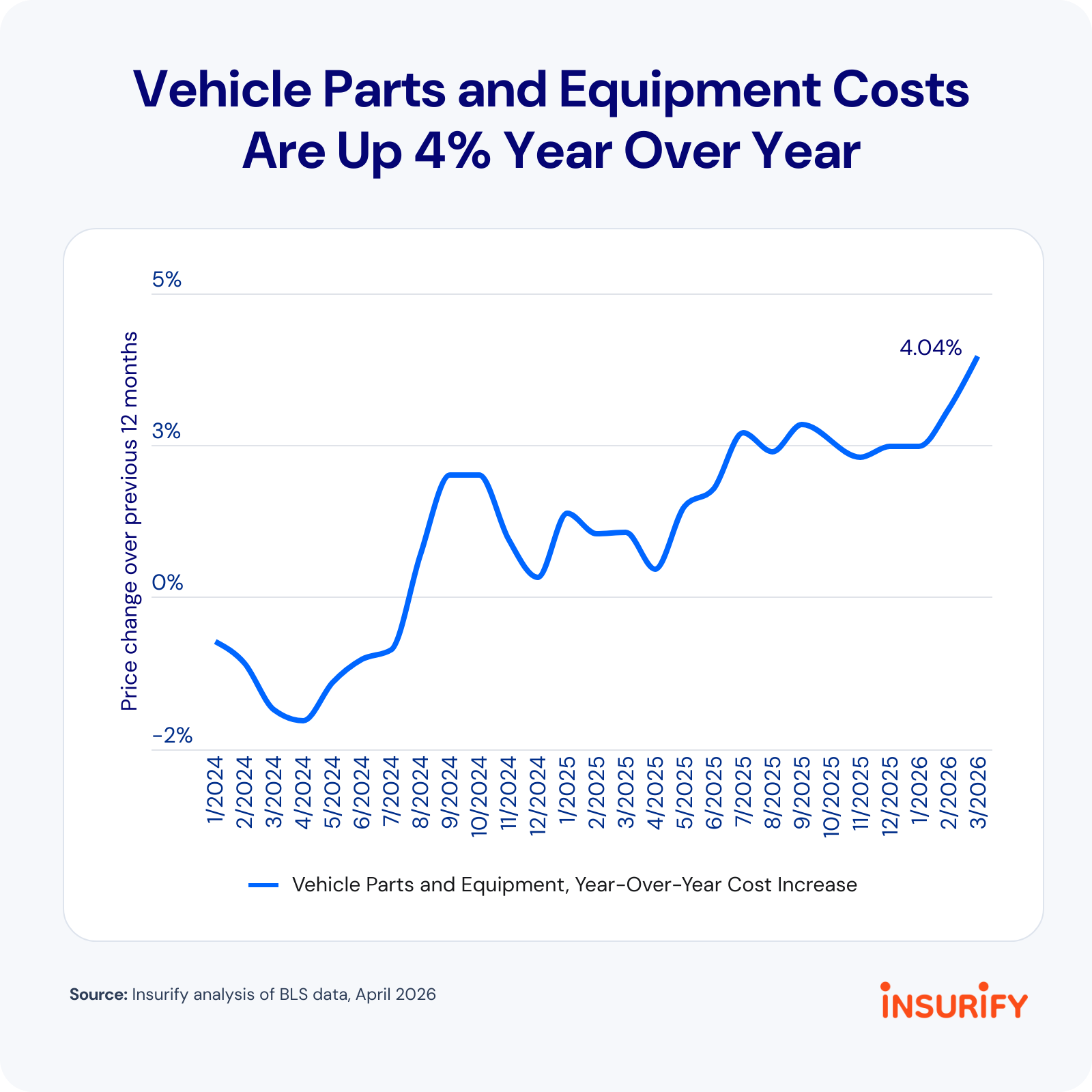 Inflation and higher prices for car parts could put upward pressure on insurance rates if sustained. The average cost of auto parts is up 4% since last April, the highest year-over-year figure since April 2023.