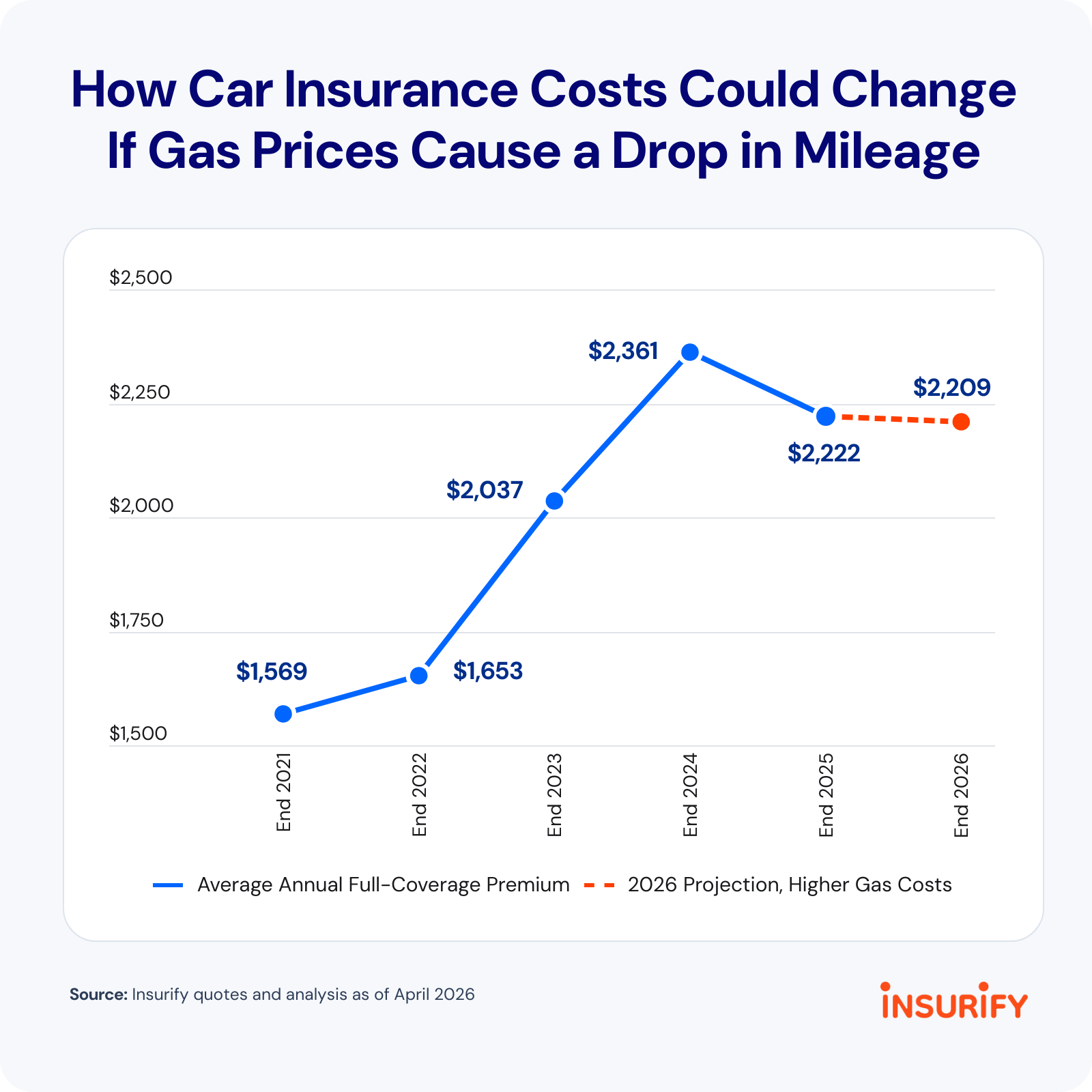 A 10% decrease in average mileage could mean lower full-coverage car insurance rates for the typical driver by the end of 2026. The average cost of car insurance at the end of 2025 was $2,222 per year. Before the war, Insurify projected a 0.7% increase for 2026, up to $2,236. But Insurify data scientists project that if the average driver travels 10% fewer miles, the cost would fall to $2,209, a decrease of 0.6% by the end of the year and a net decrease of 1.2% ($27) from Insurify’s pre-war projection.
