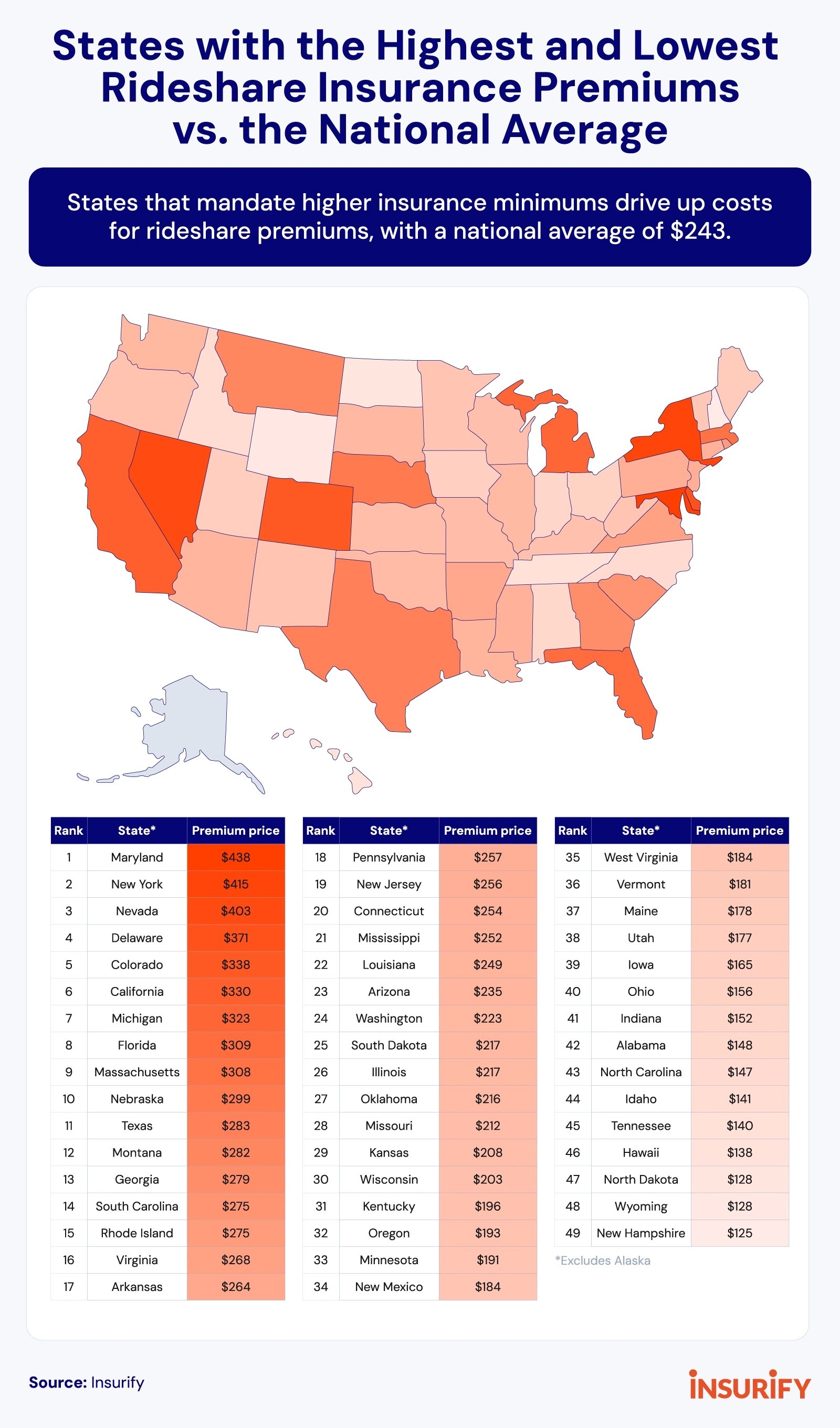States with the highest overall monthly rideshare premiums include Maryland ($438), New York ($415), Nevada ($403), and Delaware ($371), according to Insurify data. Each exceeds the national rideshare average of $235 by more than $100, per Insurify data. But total cost doesn’t tell the whole story.