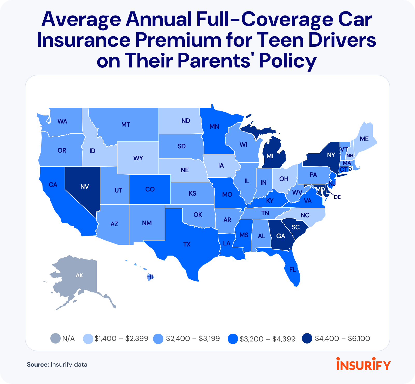The national average cost of car insurance is $2,310 per year, according to Insurify data. Teens joining their parents’ policies pay an annual average of $3,435 for full coverage, almost 50% more than the national average rate. But, in some states, young drivers have to pay nearly double that amount for insurance protection.
