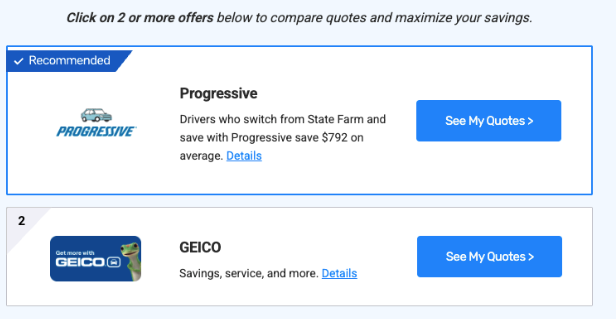 When we went through the survey, Insure.com showed us two insurance “offers” from Progressive and GEICO, but no real quotes. Selecting “See My Quotes” redirected us from Insure.com to the website of each insurer we clicked on. Even then, we still needed to answer another series of questions to receive an actual quote.