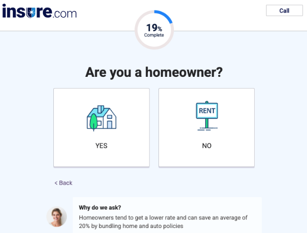 Yes. Insure.com offers a simple digital experience with straightforward directions to guide you through the quote process. You’ll have to answer several questions, but the steps are simple to follow. The “Why do we ask?” feature at the bottom of the page is a handy helper to guide you in how your answers affect your insurance quotes.