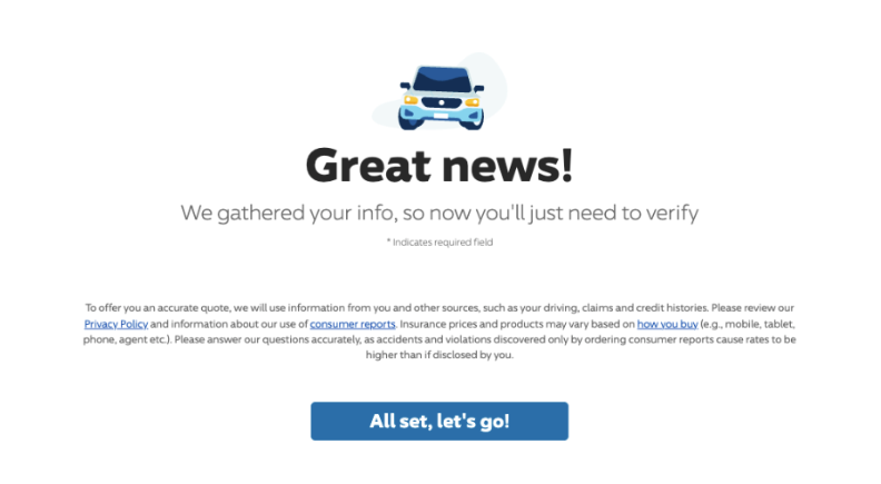 Your basic information is already input into the insurer’s quote flow, but you’ll need to add more detailed information to get an actual quote.