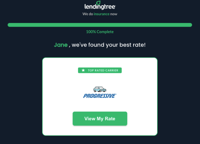 Upon completing the survey, LendingTree displays one insurer recommendation and no prices. Once you select “View My Rate,” LendingTree directs you to its partner insurance company.