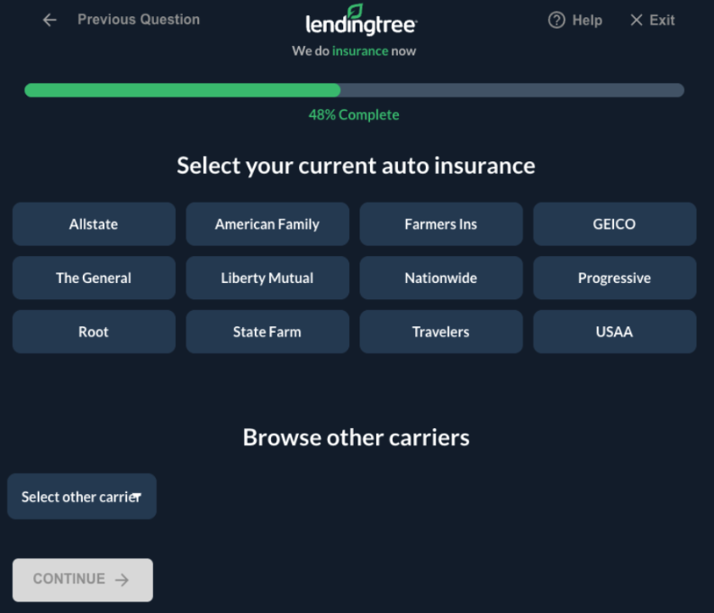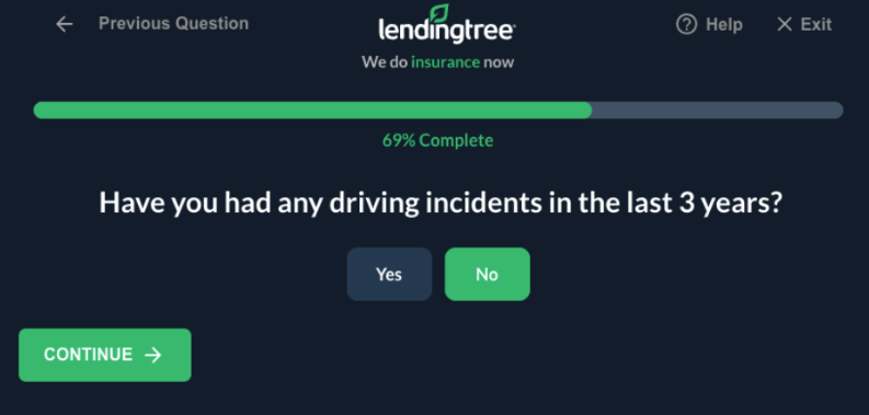 Next, LendingTree asks about your insurance coverage history, including whether you have coverage, who your insurer is, and how long you’ve held insurance for.