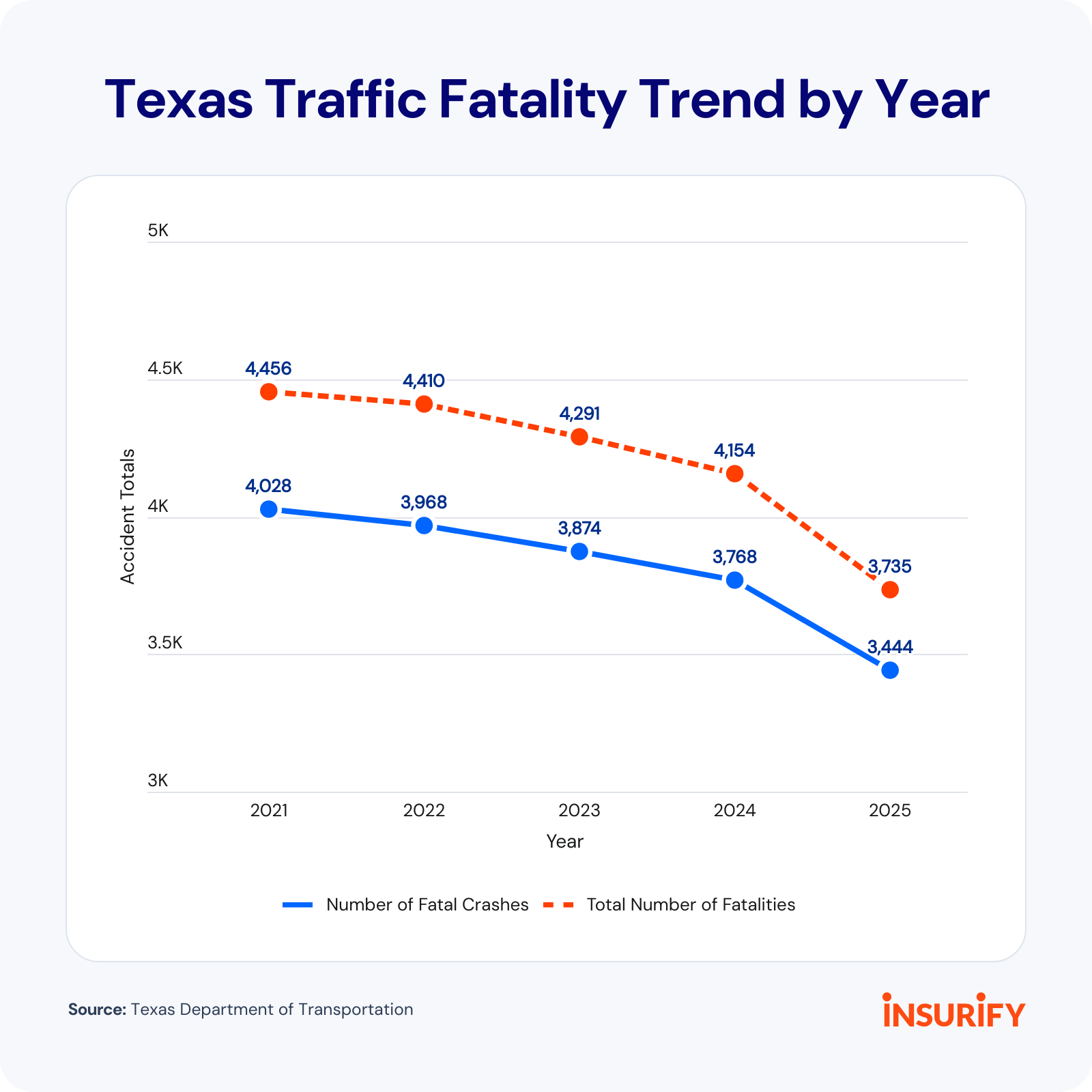 Accident totals are down overall in Texas, dropping 3% between 2024 and 2025. The longer-term decrease since 2021 was slightly smaller, at 2.75%.)