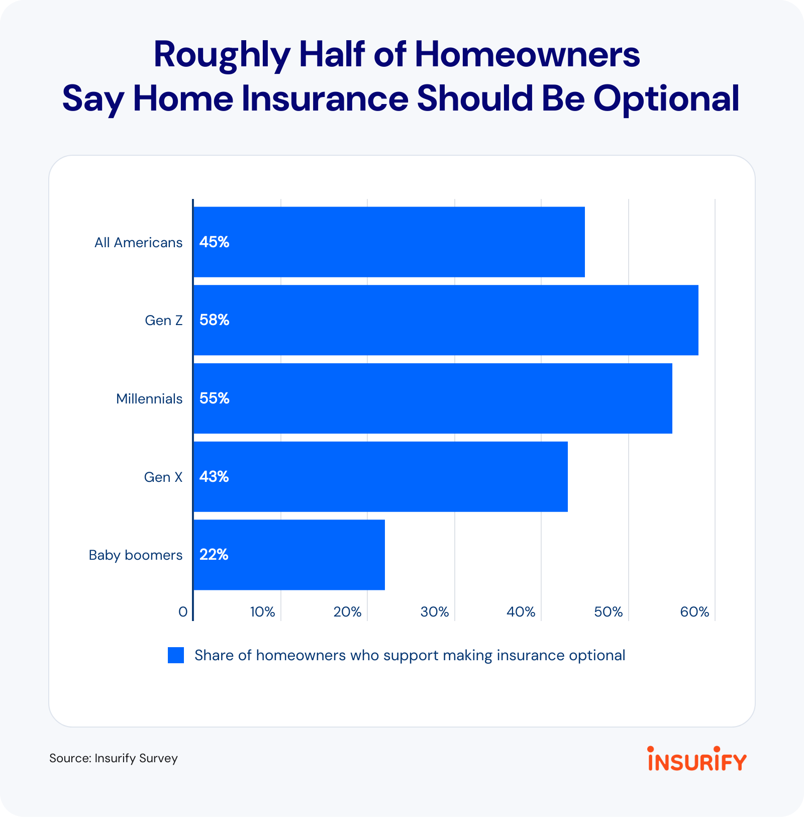 But some homeowners would be willing to roll the dice. Nearly 3 in 10 Americans (28%) would drop their coverage if they could, Insurify found. And nearly half (45%) believe homeowners should at least have the option to drop their coverage.