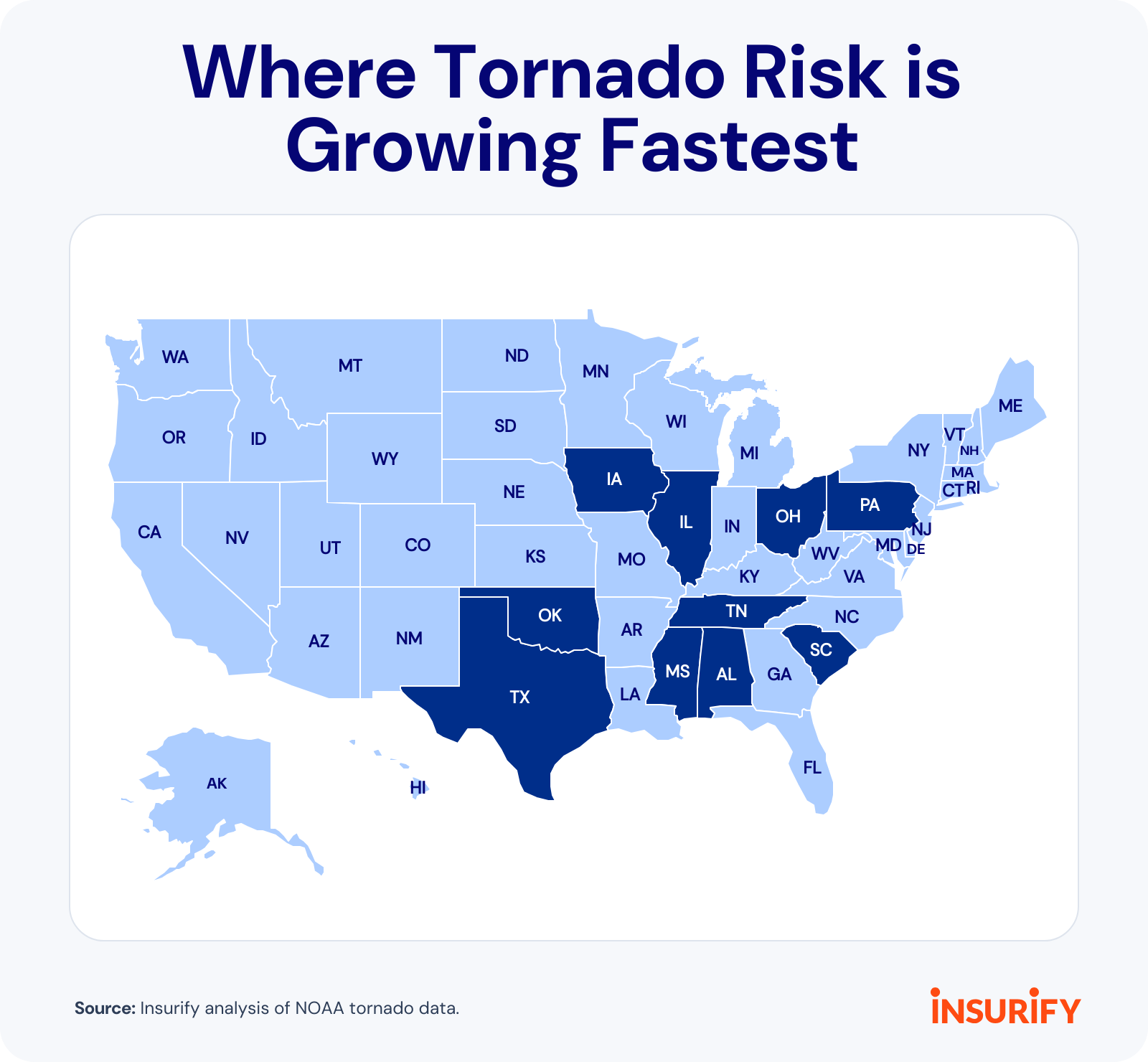 Insurify used NOAA data to determine where tornado risk exposure is growing fastest, ranking states based on the percent change in the number of days with at least one tornado event, the number of tornado events, and the amount of monetary losses between two decades, 2005–2014 and 2015–2024. Analysts also used the number of tornadoes EF3 or stronger in each state from 2015 to 2024 in the ranking. Insurify excluded states from the ranking if they had 40 or fewer tornado days or events in either decade.