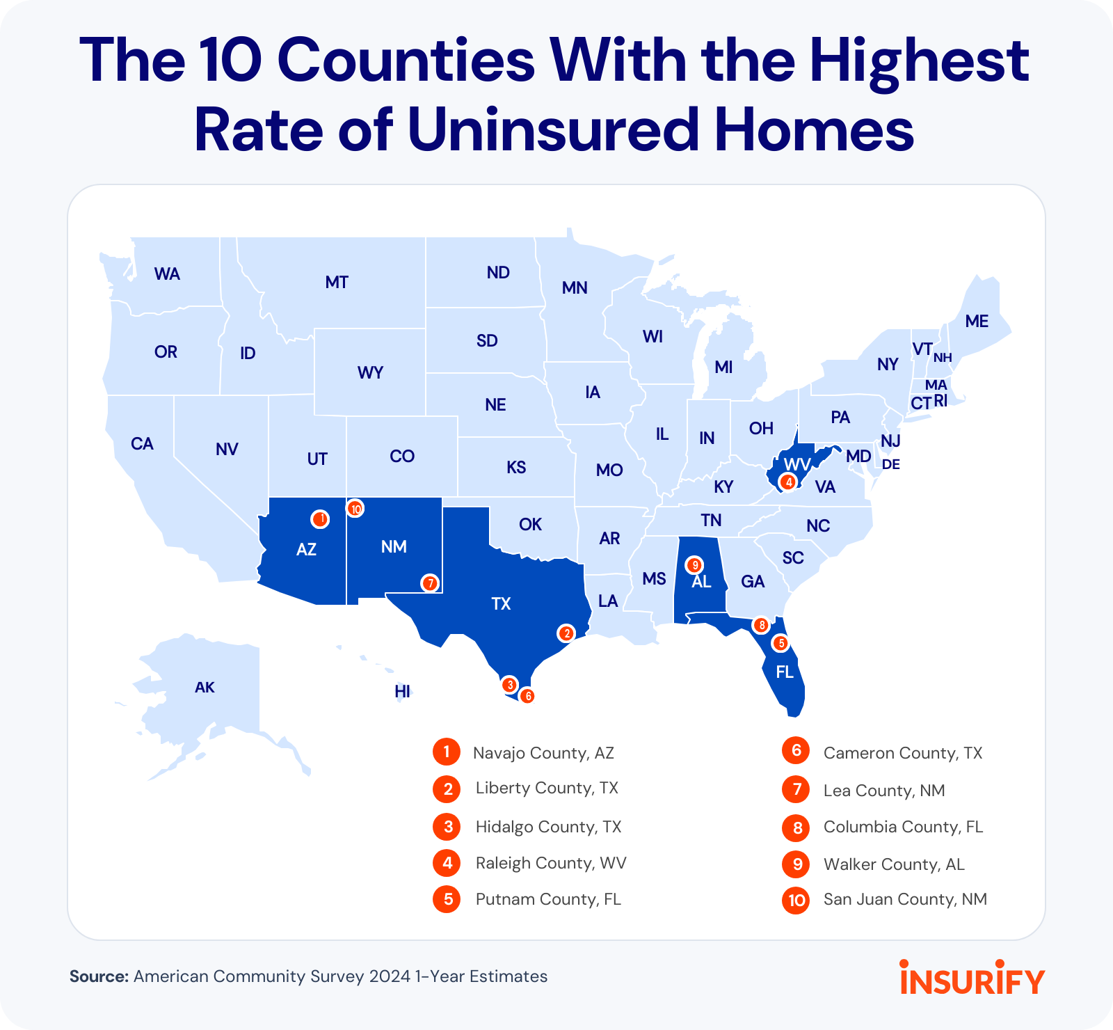 Three Texas counties — Liberty, Hidalgo, and Cameron — are among the 10 counties with the highest uninsured home rates in the country.