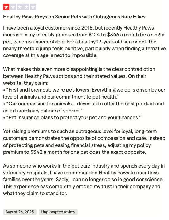 Healthy Paws has more mixed reviews, with a lower rating of 3.7 out of 5. Dissatisfied customers complain about high price increases for aging pets and decreased customer service quality, while happy customers cite easy claims handling and reimbursement.