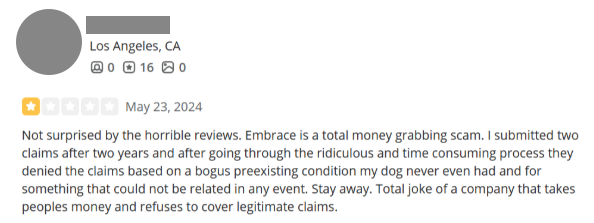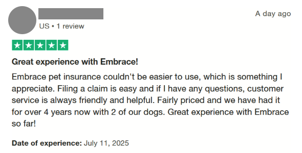 Embrace and Trupanion both have a Trustpilot rating of 4.1 out of 5 stars based on thousands of customer reviews. The two companies also have similar average ratings on Yelp — Embrace has a rating of 2.1 out of 5 stars based on more than 650 reviews, and Trupanion has a rating of 2.2 out of 5 stars based on more than 1,300 reviews.