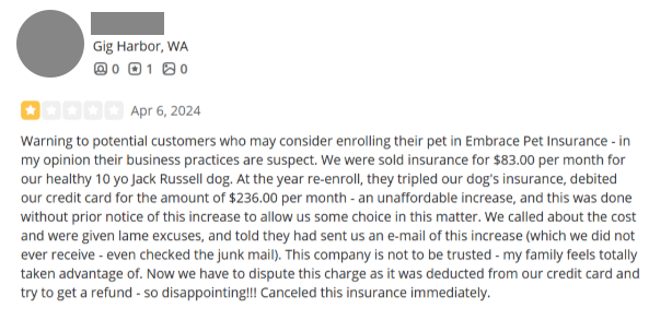 But some customers complain that premiums increase substantially with each new policy term, and many customers disagree with Embrace about a claim denial on the basis of the pre-existing conditions exclusion.