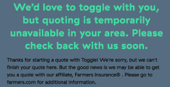 Toggle has limited state availability, offering insurance policies in 33 states and Washington, D.C. That said, our attempts to receive quotes for addresses in major cities in two of those states (Columbus, Ohio, and Milwaukee, Wisconsin) were unsuccessful.