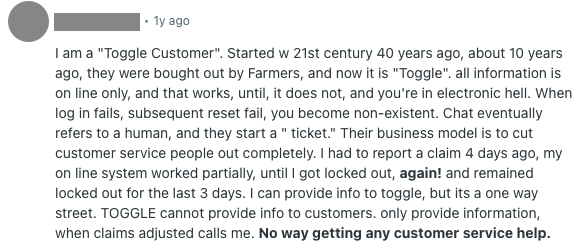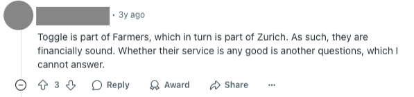 Customers haven’t left many reviews — negative or positive — of Toggle’s renters insurance on Reddit. But the positive reviews and commentary tend to focus on Toggle’s parent company, Farmers, being a financially sound insurance company.